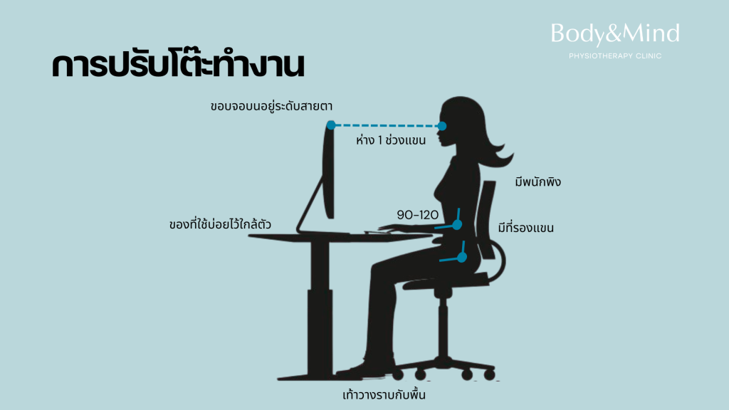 ควรมี lumbar support หรือหมอนรองเอว - ข้อศอกงอประมาณ 90–120 องศา