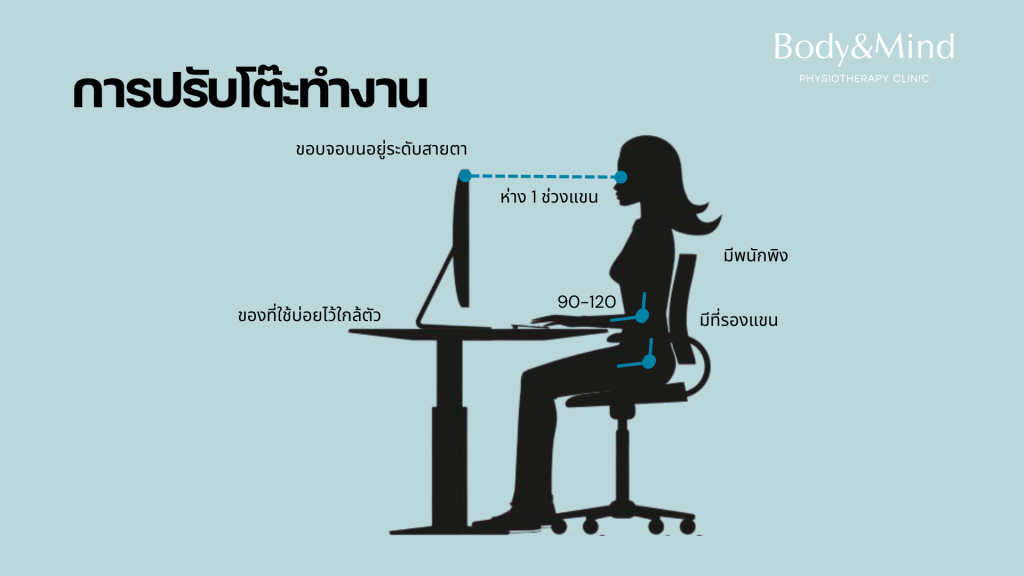 - แขนและข้อมือ: ควรวางแขนและข้อมือในตำแหน่งที่สบาย ไม่สูงเกินไป เพราะจะทำให้เกร็งบ่า